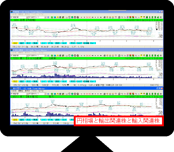 2)上段に為替(ドル円チャート)、中段に輸出関連銘柄、下段に輸入関連銘柄を表示