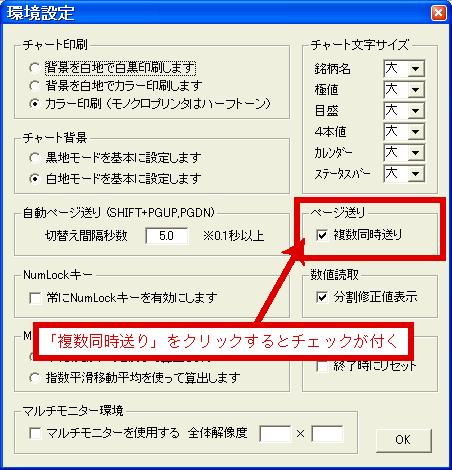 上下複数ウインドウ表示で、銘柄送り・戻りボタンをクリック、もしくは「Page・Up、Page・Down」キーを押すと、上下のチャート画面が両方とも送られます。