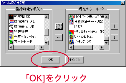| これと反対に、現在ツールバーにあるボタンを表示させないようにするには「ツールボタン設定ウィンドウ」で該当するボタンを「現在のツールバー」の一覧の中から「登録可能なボタン」の一覧へと移動すればよいということになります。 |
